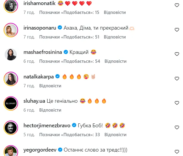 Реакція підписників і колег не забарилася. У коментарях користувачі підтримали самоіронію артиста та продовжили жартувати у тому ж тоні. Зокрема, Маша Єфросиніна коротко написала: "Кращий", Ірина Сопонару додала: "Дімо, ти прекрасний", а Ектор Хіменес-Браво зауважив: "Губка Боб!"