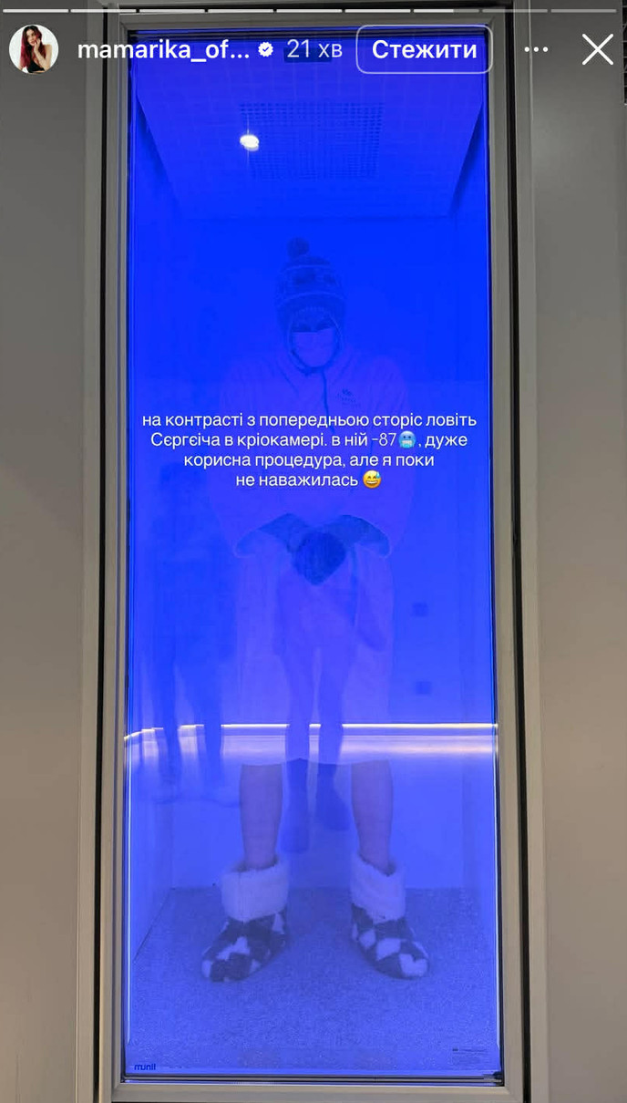 "На контрасті з попередньою сторіс ловіть Сєргєіча в кріокамері. У ній -87 градусів. Дуже корисна процедура, але я поки не наважилась", - написала зірка.