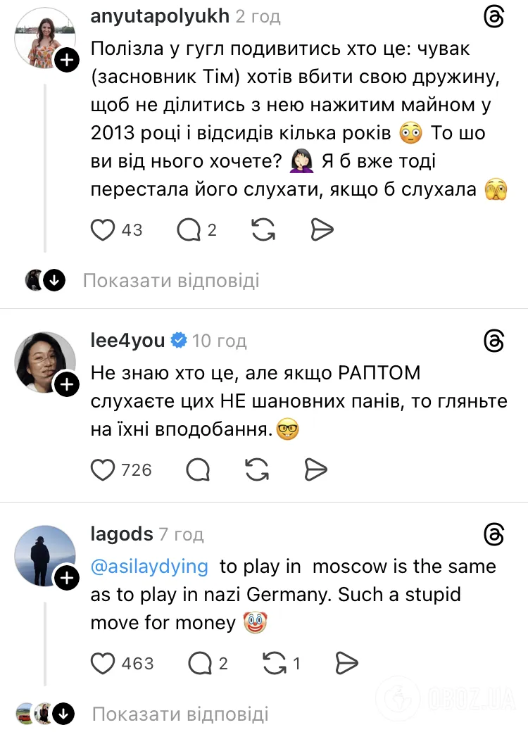 Їхньою помилкою було оголосили цю інформацію у Threads – соцмережі, яка дуже популярна серед українців. Там гурт "повезли" на "шакалячому експресі", нагадуючи про звірства росіян в Україні, а своє обурення висловив також хітмейкер Артем Пивоваров.