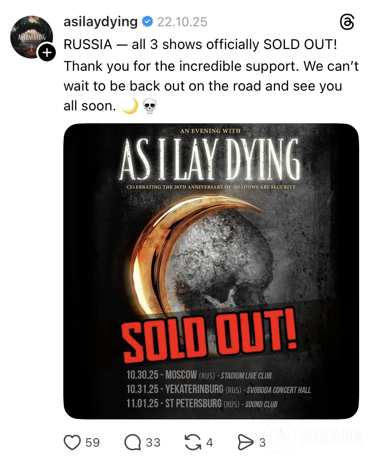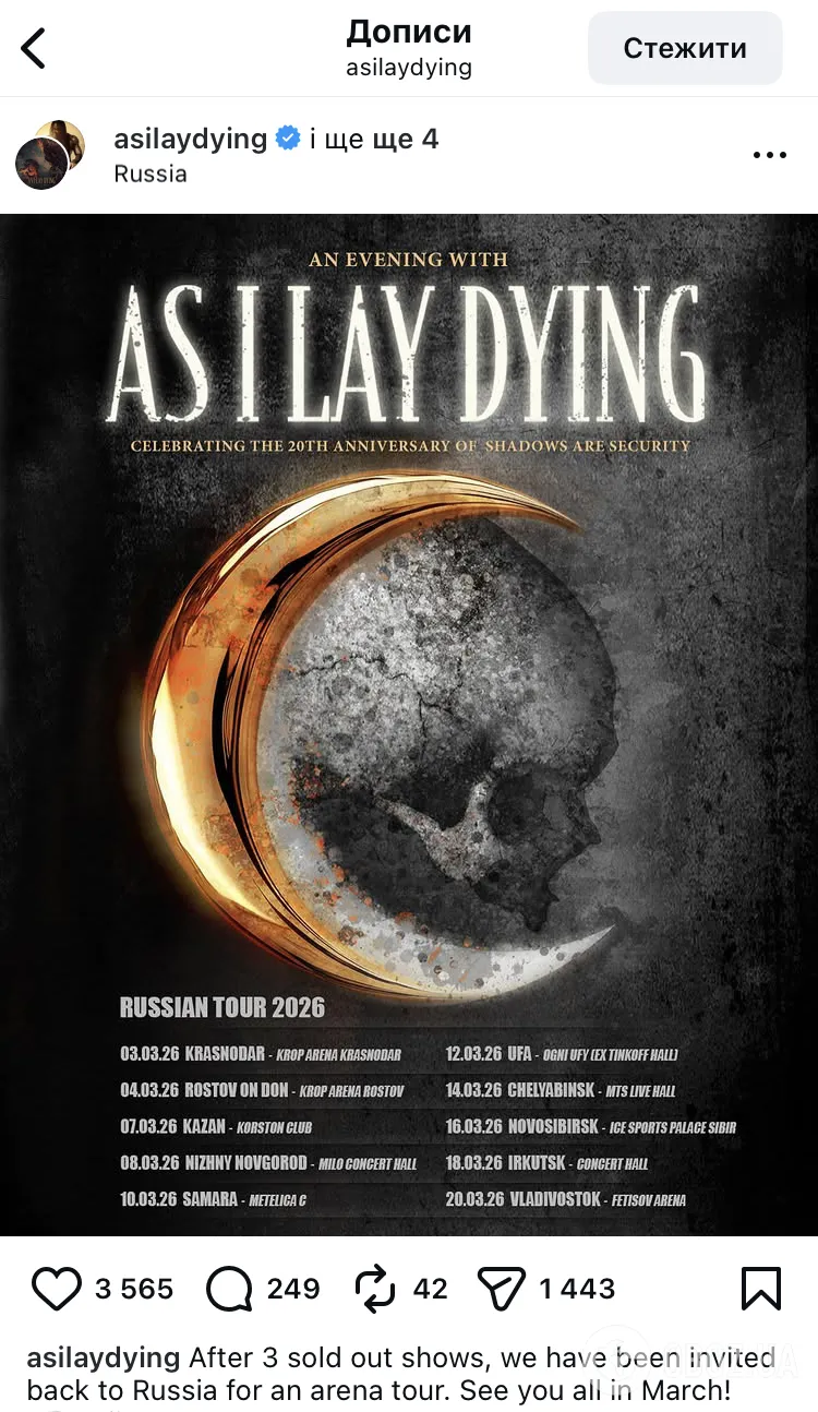 На такий відчайдушний крок заробити побільше грошей на росіянах учасники пішли не без причини. У жовтні 2025-го вони уже виступали у РФ: в Москві, Єкатеринбурзі та Санкт-Петербурзі. Там відбувся солд-аут, що, ймовірно, і спонукало As I Lay Dying повернутися знову.