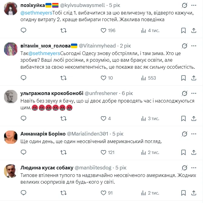 Під час ефіру популярного в США телешоу Late Night with Seth Meyers американський ведучий Сет Майєрс допустив репліку, яку глядачі сприйняли як образливу та неосвічену. Йдеться про невдалий жарт щодо Одеси, який у соцмережах розцінили як поширення російського наративу.