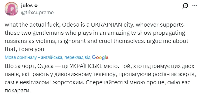 Серіал "Запекле суперництво" присвячений російським персонажам, а в проєкті задіяно чимало російських акторів. На цьому тлі репліка Майєрса виглядала не просто як географічна помилка, а як легковажне відтворення російського культурного маркера.