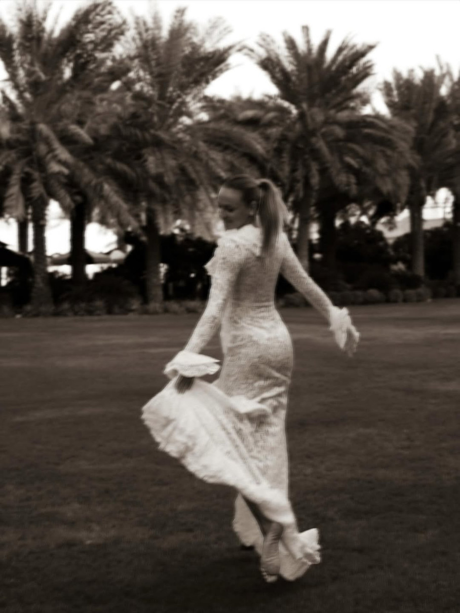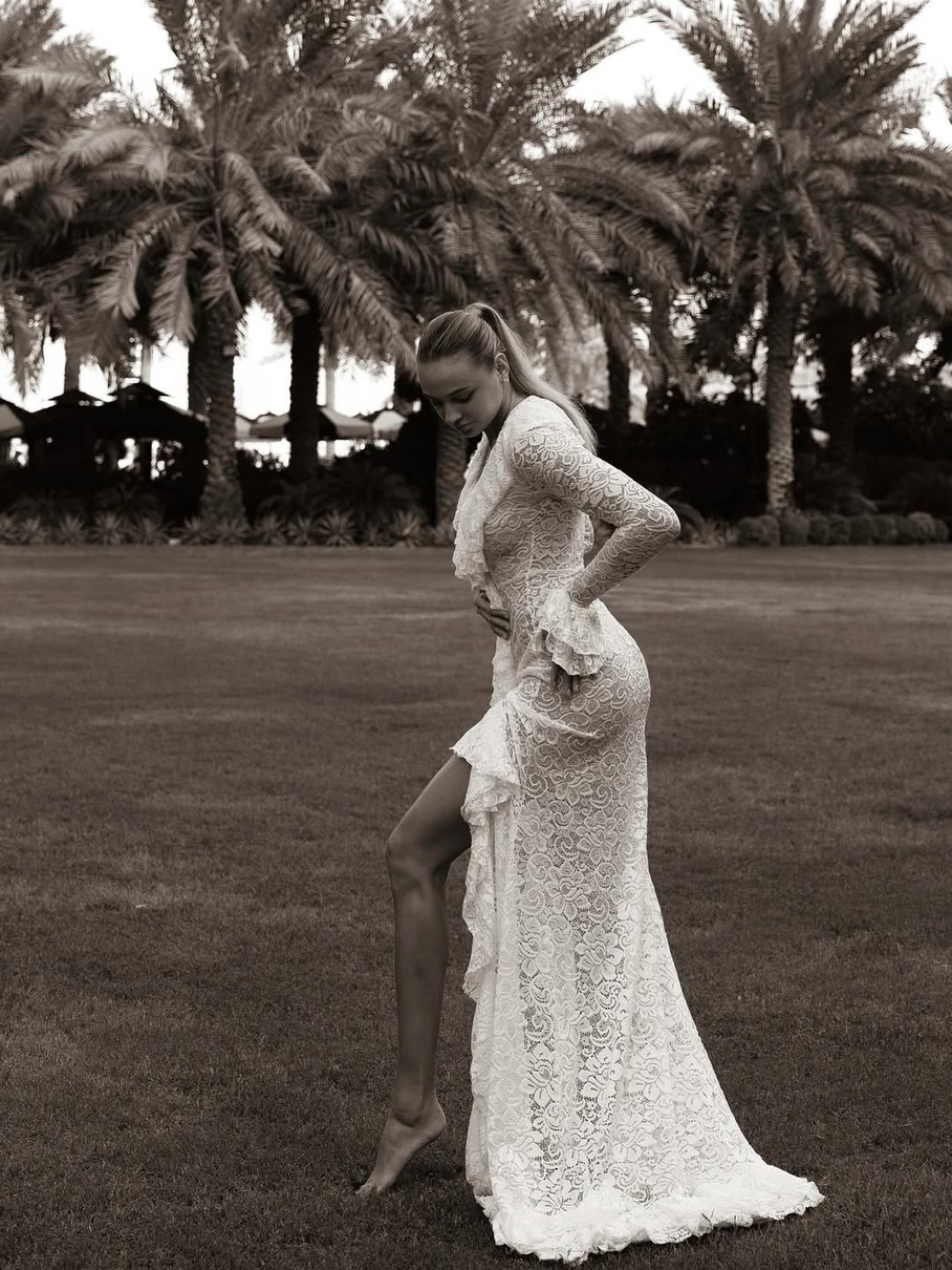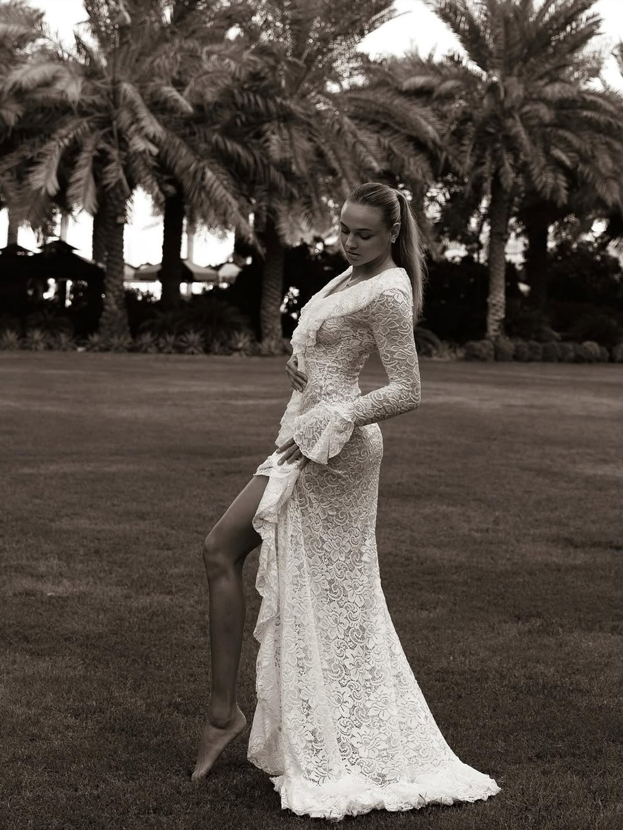 Цього разу Дар'я попозувала під час відпочинку в білій мереживній довгій сукні з рюшами і високим розрізом, боса на тлі пальм.