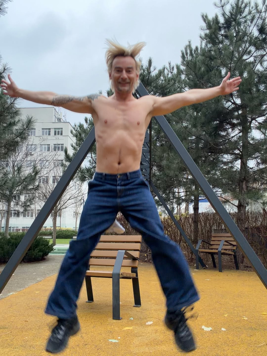 Алан з голим торсом показав свою ранкову зарядку просто неба. Зірка пострибав на батуті лише у джинсах та показав свою розминку та підтягування.