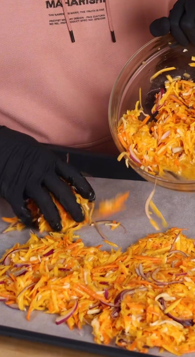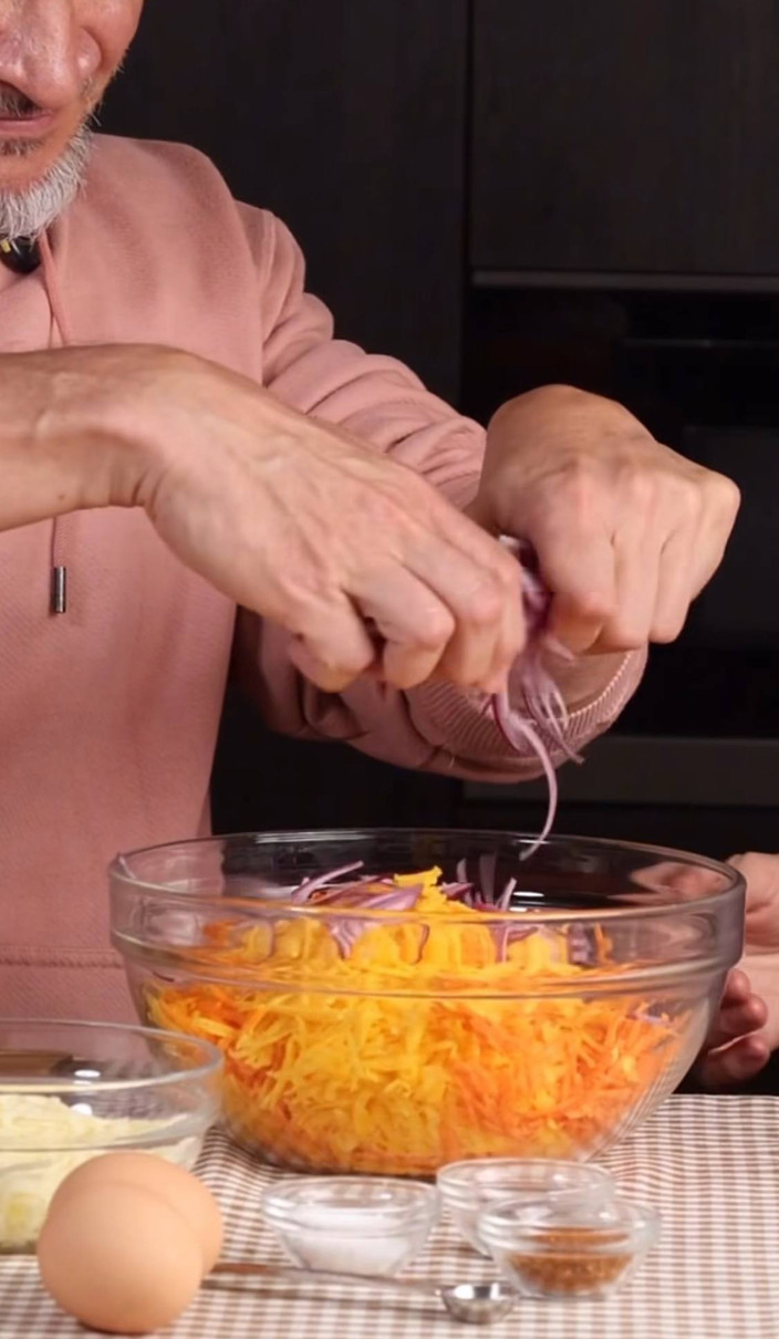 Для приготування тіста нам знадобляться: морква - 200 г, гарбуз - 250 г, легкий сир - 100 г, яйця - 3 шт, невелика червона цибуля, сіль, перець, спеції - за смаком.
