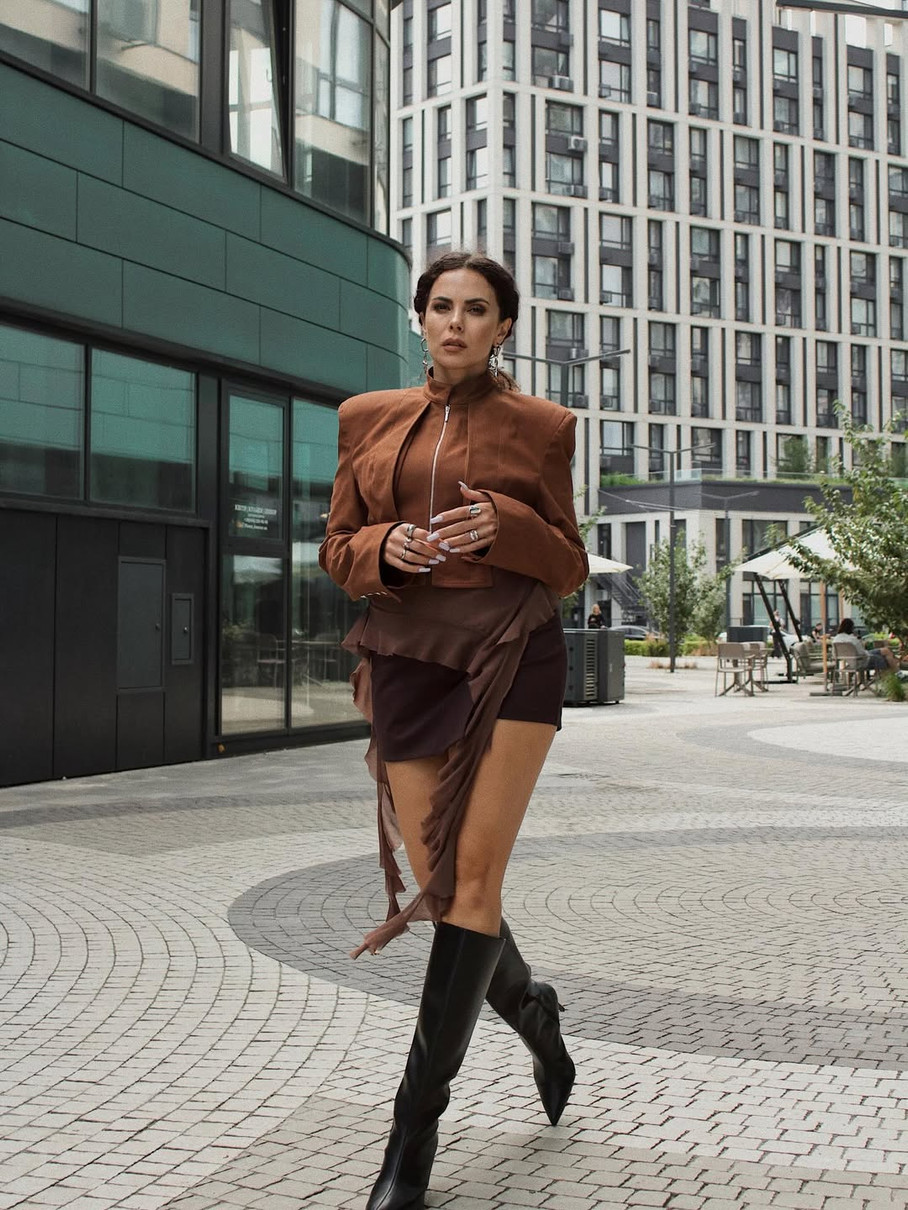 У своєму Instagram артистка виклала кілька світлин, на яких позує в короткому жакеті з квадратними плечима, дуже короткій спідничці та високих шкіряних чоботах на тонких підборах.