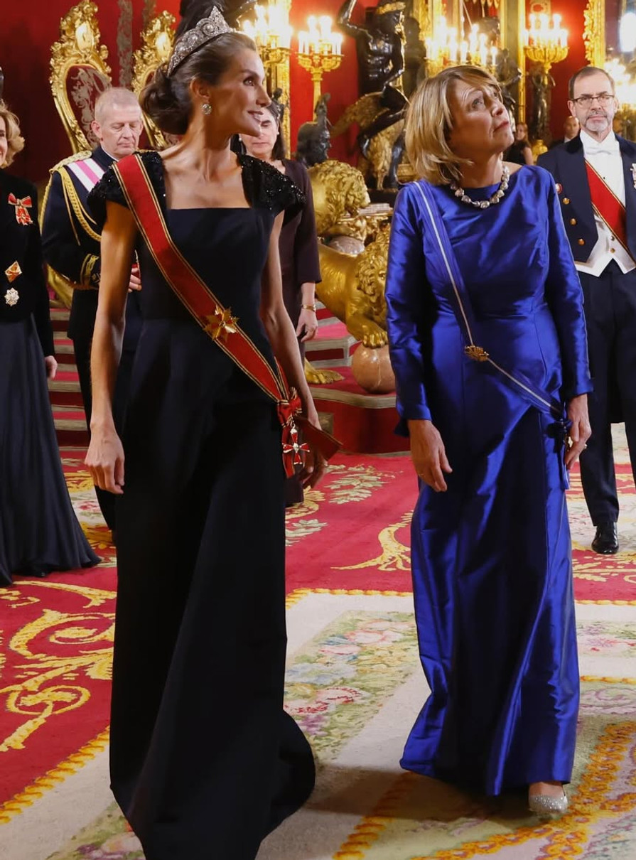 На урочистій події Летісія постала в чорній максісукні з блискітками на плечах від Carolina Herrera та у вишуканій тіарі Cartier
