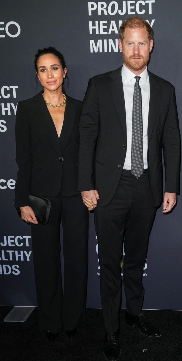 Меган і Гаррі з'явилися на заході у стриманих класичних костюмах. Маркл довершила свій чорний жакет і брюки від Armani, загальною вартістю 4600 доларів, масивним золотим ланцюгом на шиї приблизно за $700, чорним клатчем від Armani за $1700 та зібраним волоссям.