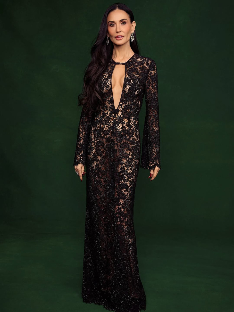 Демі вийшла на червону доріжку у напівпрозорій мереживній сукні чорного кольору від бренду Gucci. До речі, плаття було розшите вручну блискітками та мало виріз до пупка.