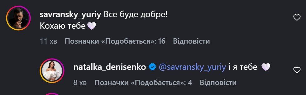 Акторка Наталка Денисенко публічно підтвердила нові стосунки після резонансного інтерв’ю про розлучення з актором-військовим Андрієм Федінчиком. Під її дописом у соцмережах з’явився коментар манекенника та підприємця Юрія Савранського зі словами "Все буде добре. Кохаю тебе". У відповідь акторка написала коротко, але однозначно: "І я тебе".