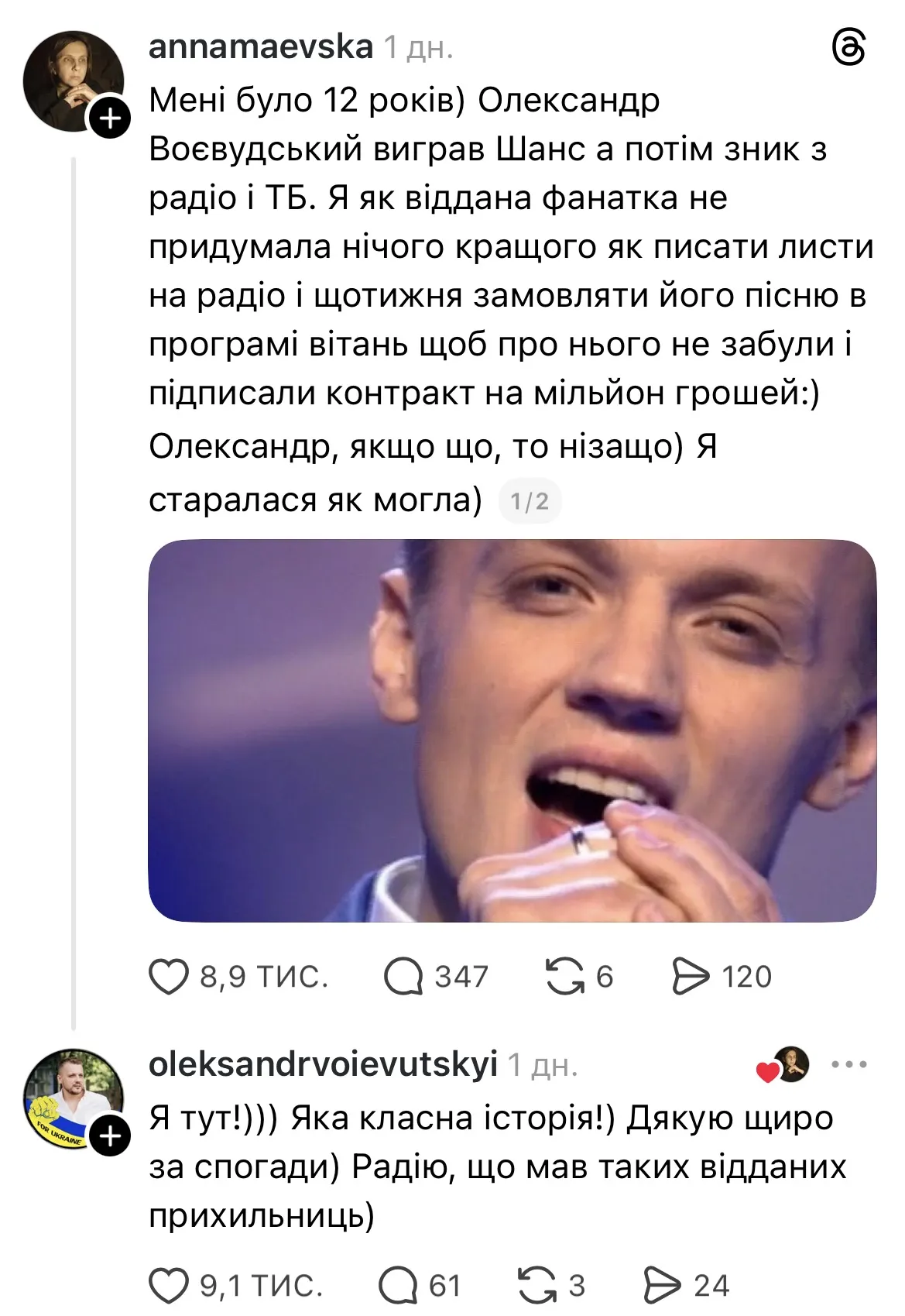 Сам Олександр Воєвуцький також долучився до обговорення й відповів на згадку про фанатську підтримку: "Дякую щиро за спогади. Радію, що мав таких відданих прихильниць".