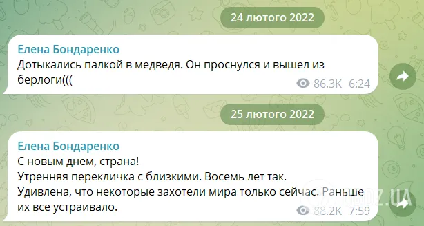 Зокрема, на початок повномасштабної війни вона відреагувала злобно: "Дотикалися палицею у ведмедя. Він прокинувся і вийшов з барлоги".