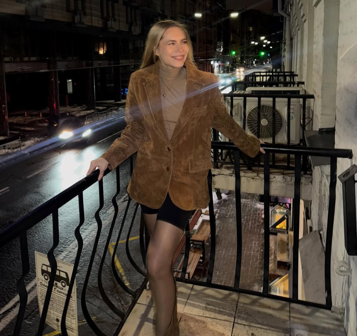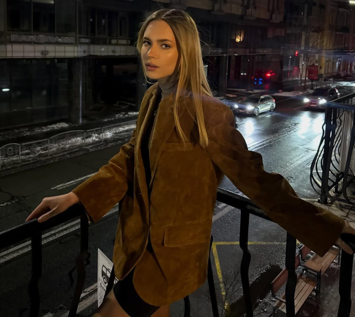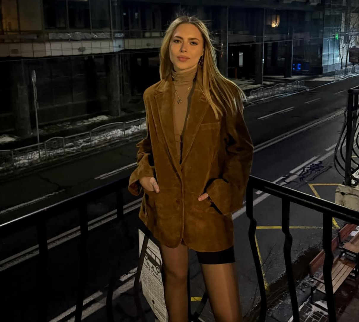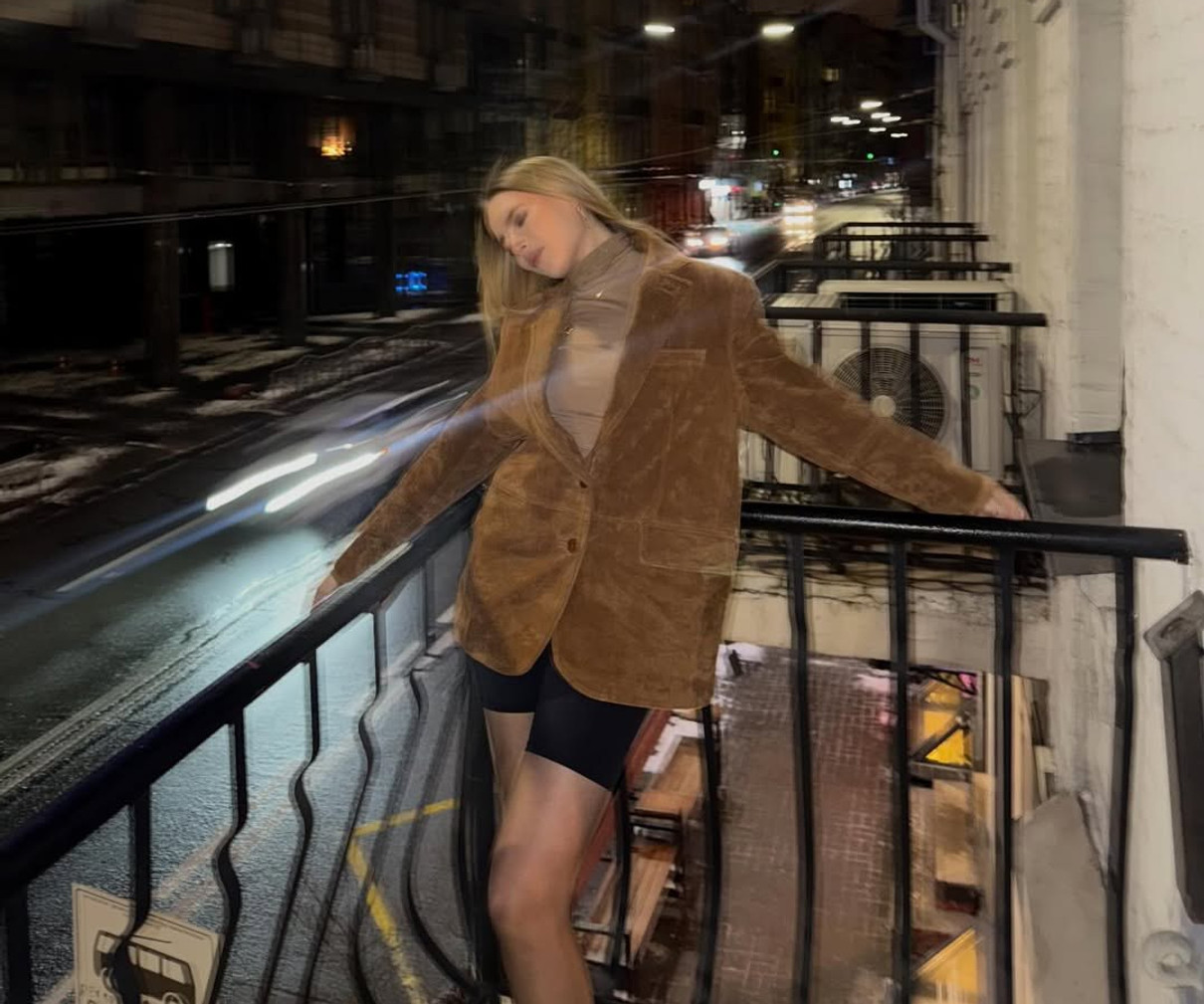 У себе в Instagram дівчина показалася на балконі в обтислих чорних шортиках, гольфі та замшевому оверсайз жакеті.
