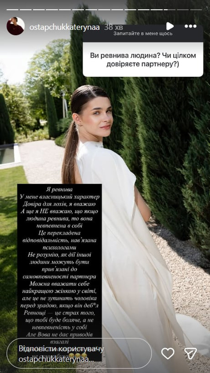"Я ревнива. У мене власницький характер. Довіра для лохів, я вважаю. А ще я не вважаю, що якщо людина ревнива, то вона невпевнена в собі. Це перекладена відповідальність, навʼязана психологами. Не розумію, як дії іншої людини можуть бути привʼязані до самовпевненості партнера", - написала Остапчук.