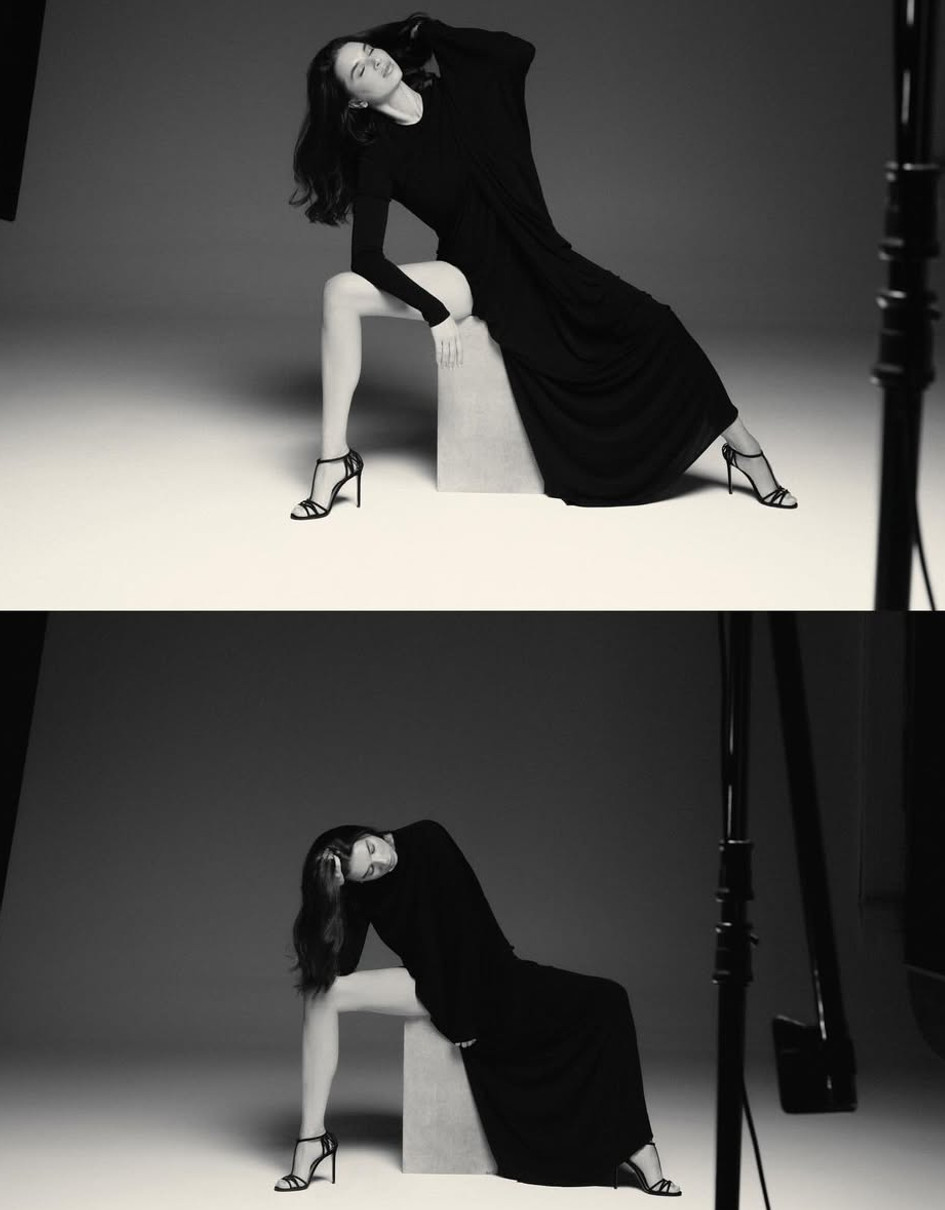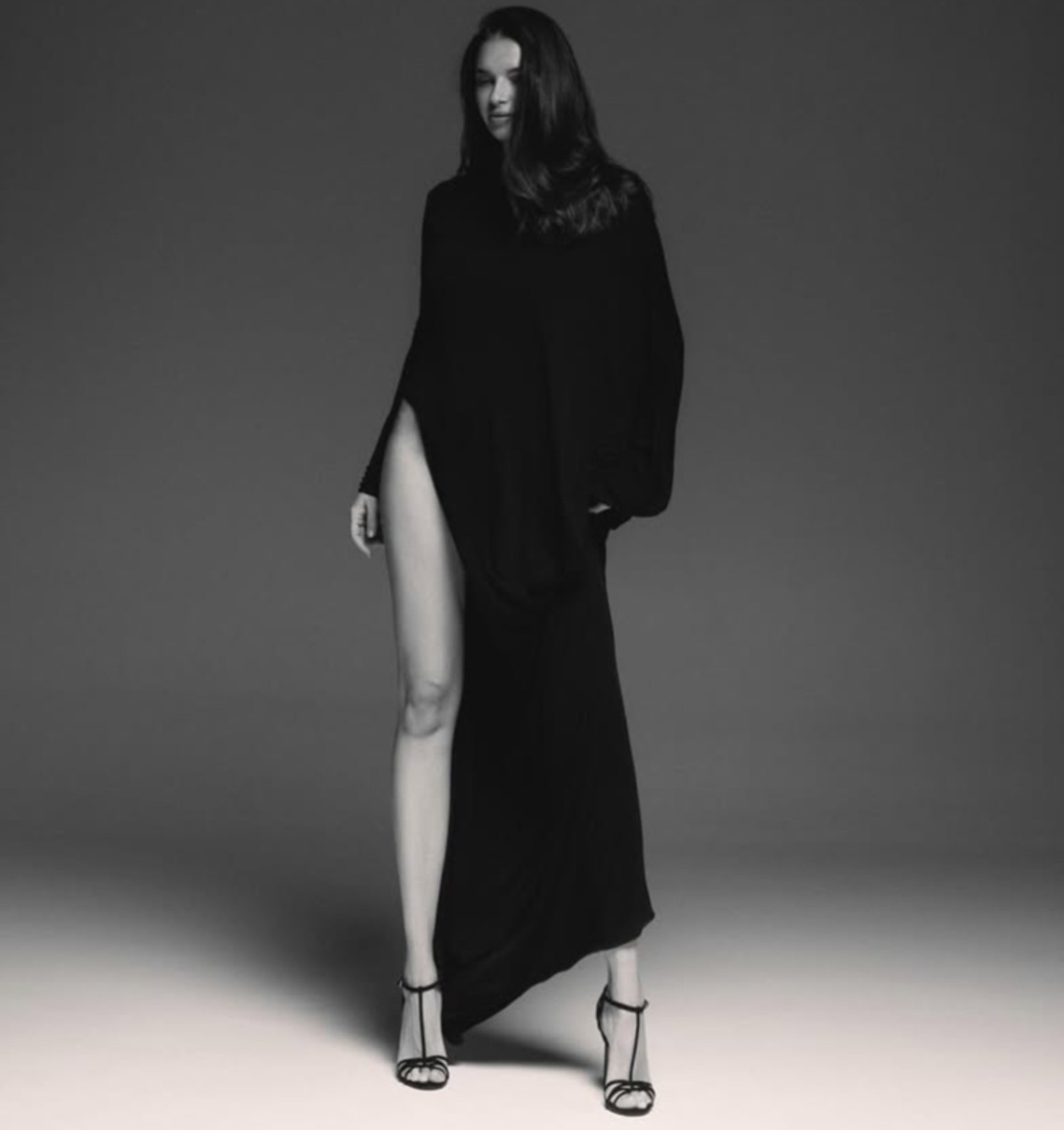 Цього разу обраниця спортсмена професійно попозувала в студії в чорній максісукні з довгим рукавом та грайливим розрізом до стегна. Результатами зйомки вона поділилася в Instagram.