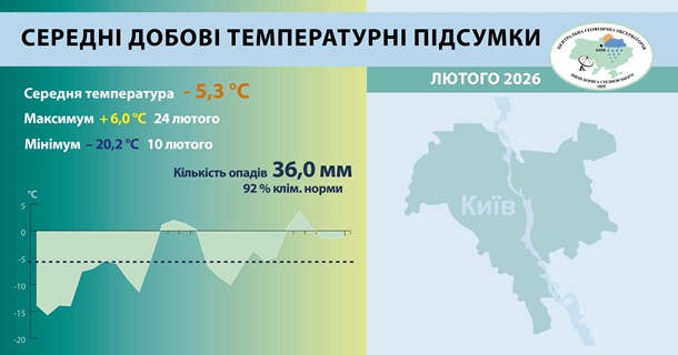 Як зазначається, за даними об'єднаної гідрометеорологічної станції Київ середньомісячна температура повітря лютого в Києві склала -5,3°С, що нижче за кліматичну норму на 3,0℃.