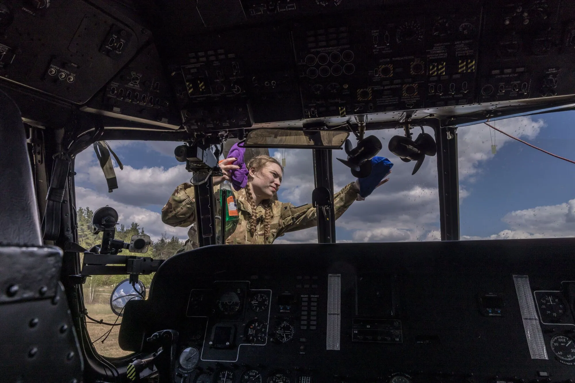 На іншому фото, зробленому Оксаною Парафенюк на сході України, зображена лейтенант Катерина – єдина жінка-бойовий пілот в українській армії. Кадр ілюструє зусилля України залучити більше жінок до служби, попри світові стереотипи про жіночу стать у війську.