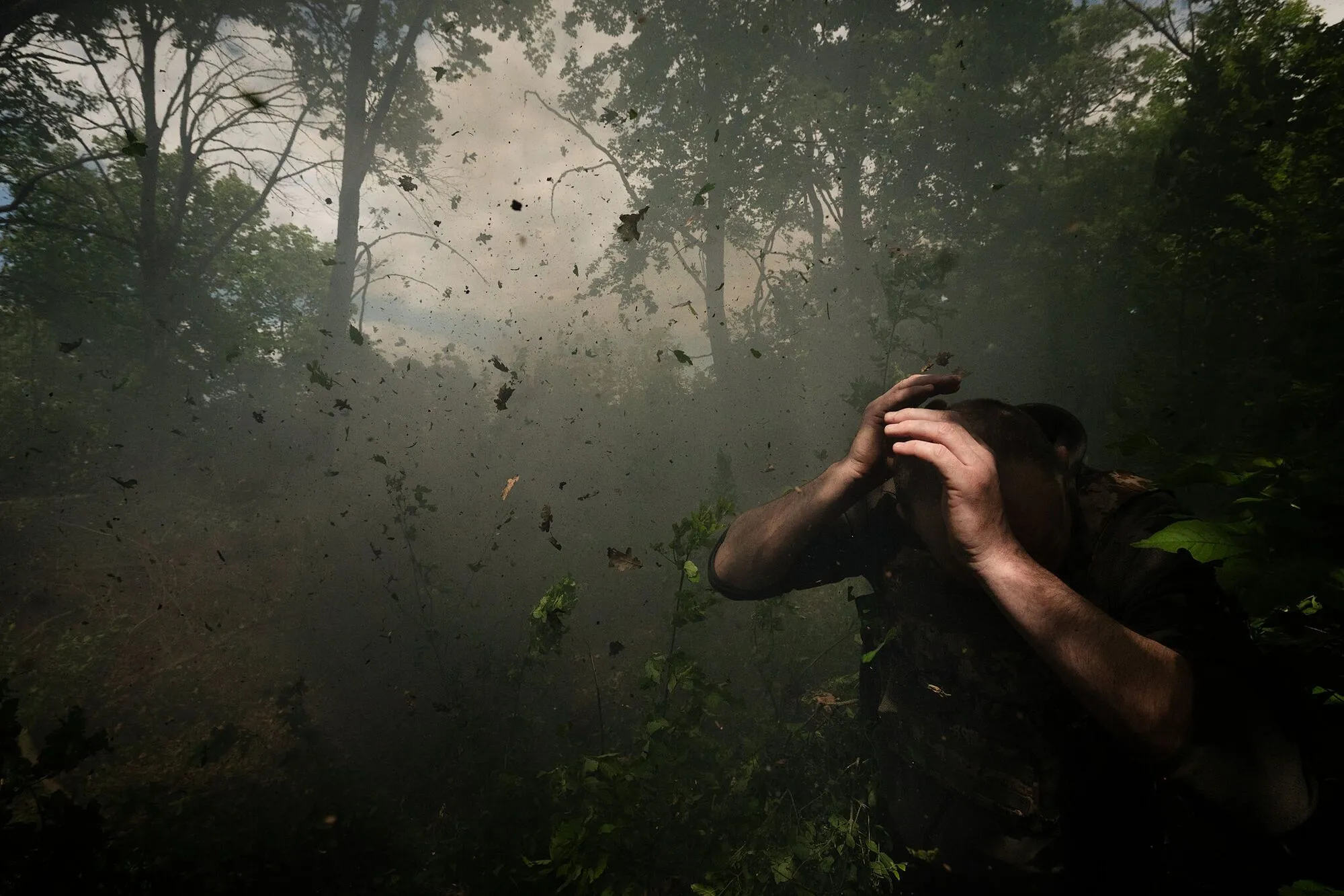 Світлина Тайлера Хікса з Куп’янського напрямку показує солдата 14-ї механізованої бригади під час стрільби. Фотограф пояснює, що через російські безпілотники артилерійські позиції нині повністю приховані під землею.