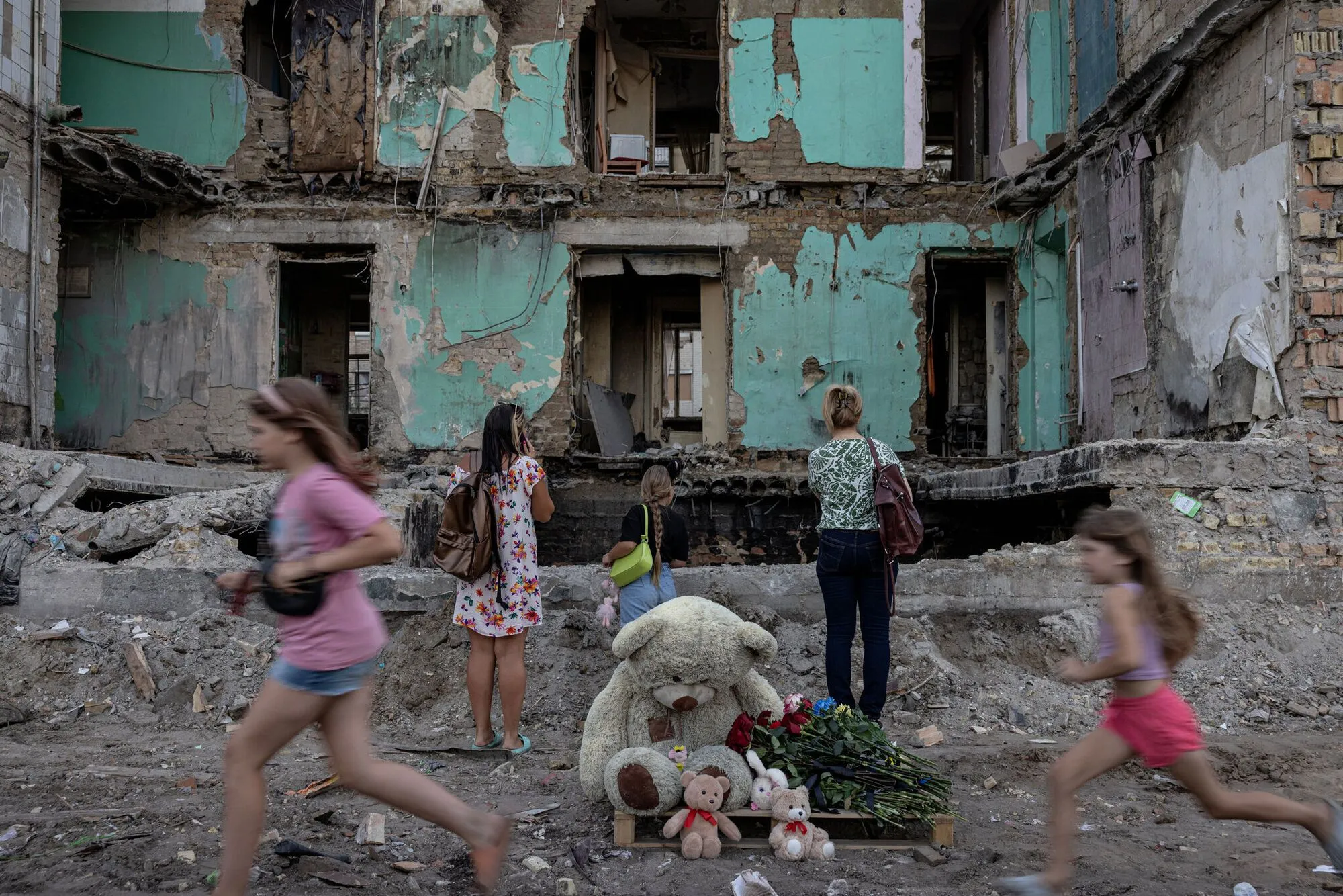 Ще один кадр Фінбарра О’Райлі зроблений у столиці. На ньому – маленький меморіал жертвам російського удару, що стався менш ніж за два тижні після зустрічі Дональда Трампа з Володимиром Путіним на Алясці. Фотограф звертає увагу на контраст між руйнуванням і повсякденним життям: діти гралися поруч із пошкодженою будівлею, поки дорослі оглядали руїни.