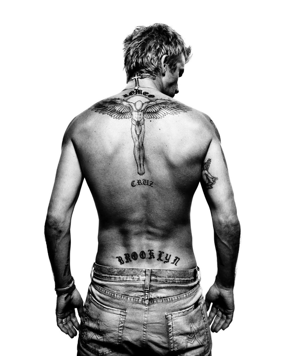 Платон показав чорно-білі світлини молодого Бекхема, на яких він позує спиною до камери й на ній чітко видно татуювання імен його трьох синів: Брукліна, Ромео та Круза.
