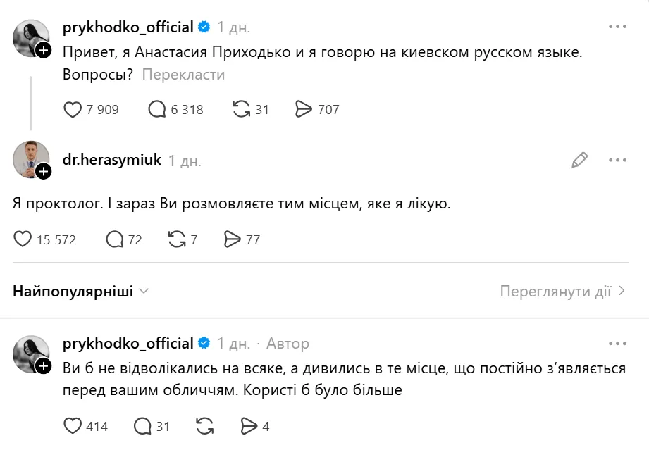 У відповідь Приходько різко відреагувала на частину коментарів, як-от саркастичний "Я проктолог. І зараз ви розмовляєте тим місцем, яке я лікую", і вступила в перепалку, використовуючи образливі формулювання, хоча уже українською мовою: "Ви б не відволікались на всяке, а дивились в те місце, що постійно зʼявляється перед вашим обличчям. Користі б було більше".
