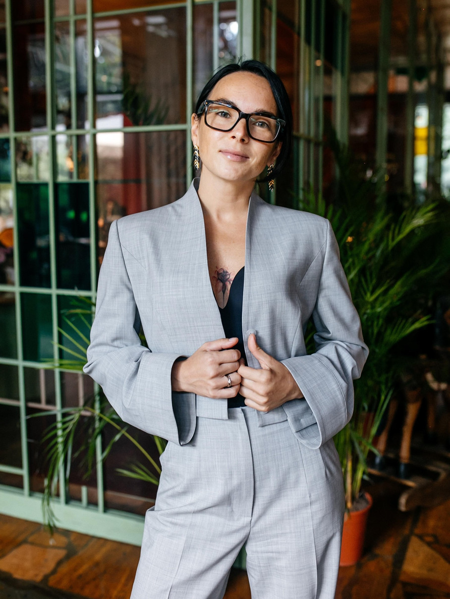 Зранку цього дня Інна виклала в мережу нові фото себе в сірому діловому костюмі та корсетному топі з декольте, яке відкривало світу її тату.
