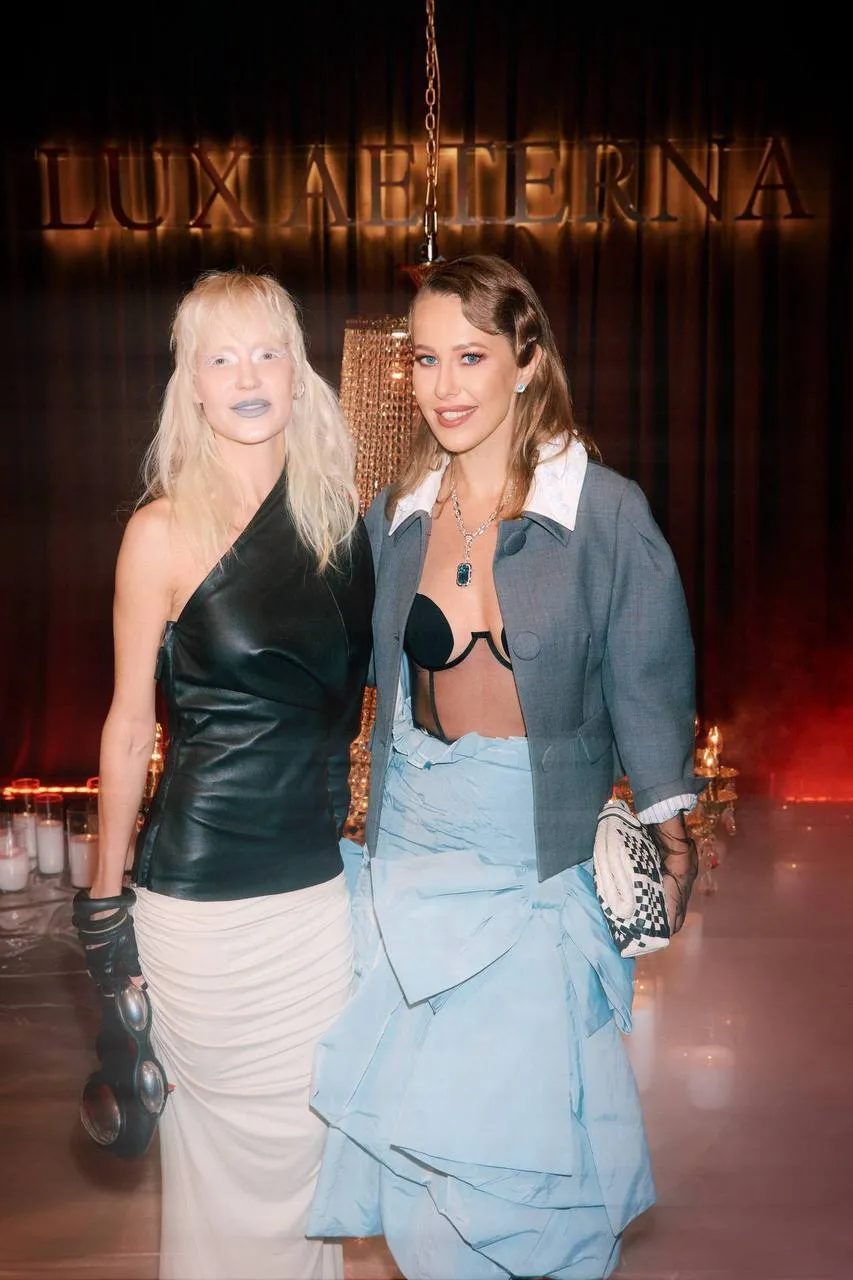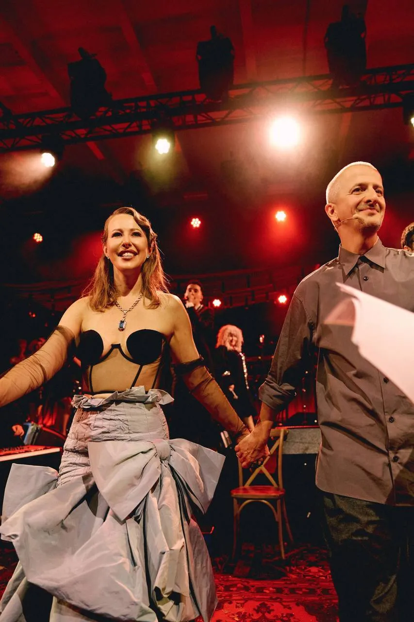 Особливий фурор викликало вбрання іменинниці. Вона одягнула синю спідницю з бантами й рюшами, прозоре бюстьє й короткий жакет. Образ доповнили сітчасті рукавички й прикраса з каменем розміром із "совість" російського телебачення.