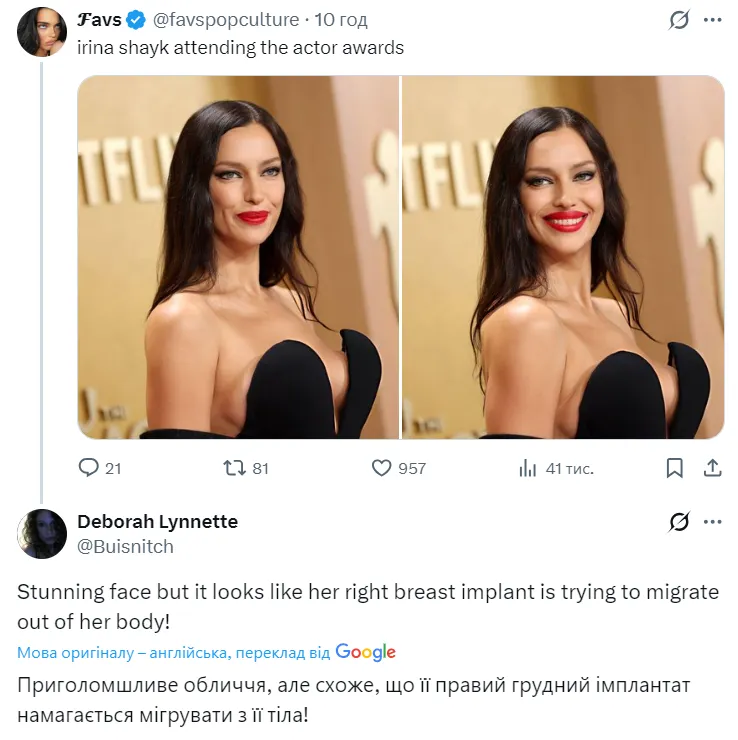 На червоній доріжці з нагоди вручення премії SAG (Actor Awards) 2026 у Лос-Анджелесі, США, російська прокремлівська модель Ірина Шейк з'явилася у відвертому образі, який викликав суперечливу реакцію в мережі. 40-річна модель обрала сукню з глибоким декольте та розрізом до стегна, через що потрапила до списків найгірше одягнених гостей заходу за версією окремих західних таблоїдів.