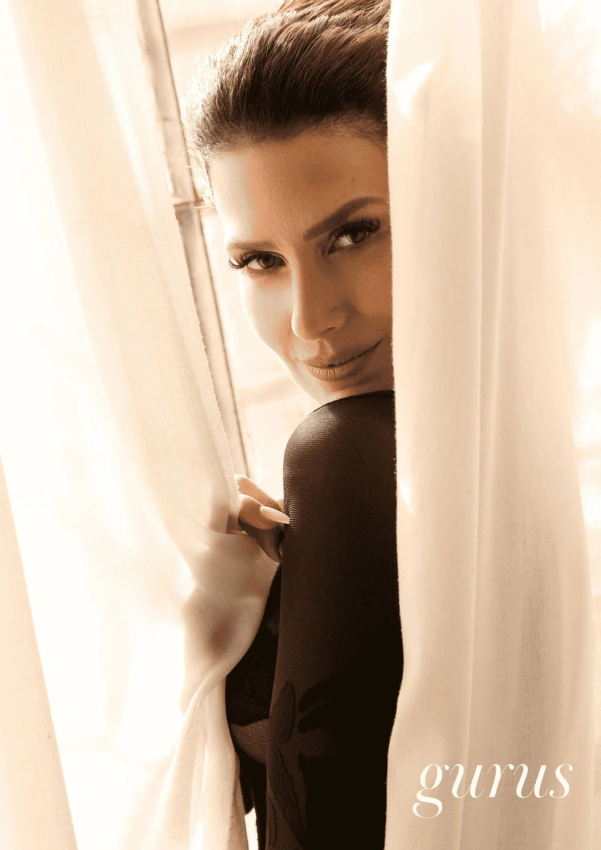 В рамках фотосесії знаменитість покрасувалась у вишуканих сукнях різних фасонів та кольорів в студії, а також зазнімкувалась у напівпрозорому боді та легінсах. В інтерв'ю багатодітна матуся поміркувала про те, який приклад хоче навіювати своїм нащадкам: