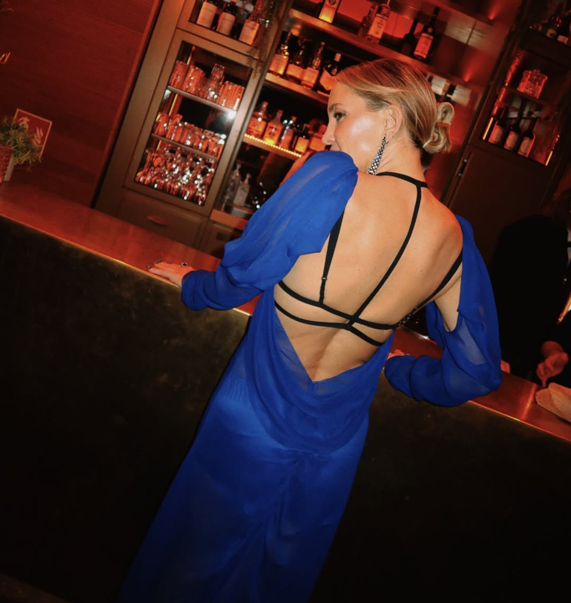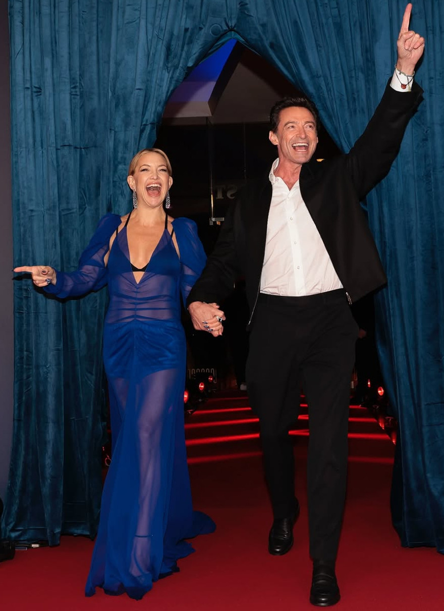 Для заходу знаменитість обрала ефектну прозору максісукню синього кольору від Vera Wang зі шлейфом. На хіднику Кейт грайливо засвітила оголену спину та попозувала зі своїм колегою по фільму, 57-річним австралійським актором Х'ю Джекманом.