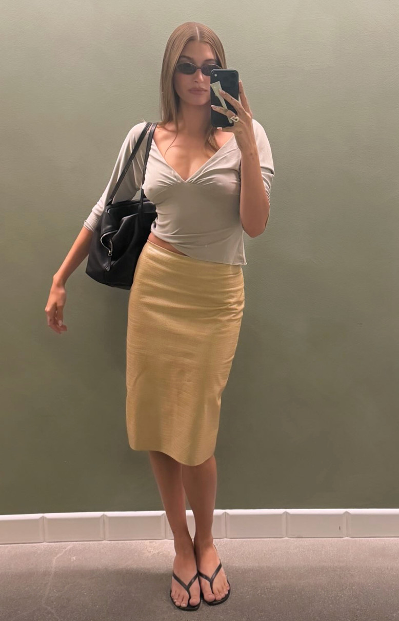 Зірка показалася в топі без бюстгальтера, а ще, схоже, їй справді полюбилися довгі спіднички