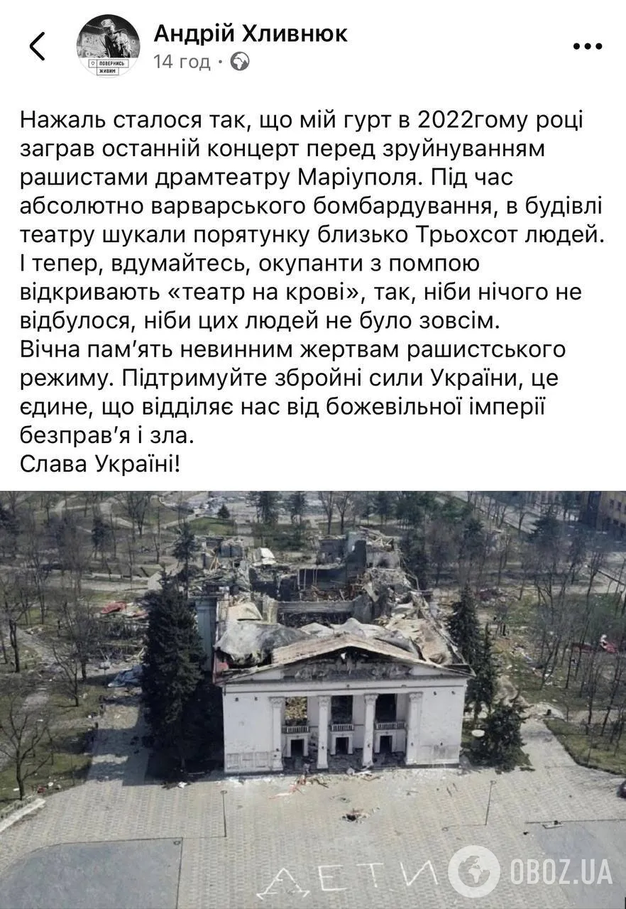 Росіяни вкотре відзначилися своїм цинізмом, адже відкрили в Маріуполі "відновлений" Драматичний театр, де на початку великої війни загинули сотні людей. Такий вчинок ворога не зміг залишити без уваги український виконавець Андрій Хливнюк, чий гурту "Бумбокс" дав останній концерт у закладі культури перед бомбардуванням. Артист публічно засудив жахливу діяльність росіян та вшанував пам'ять усіх жертв.