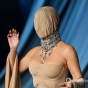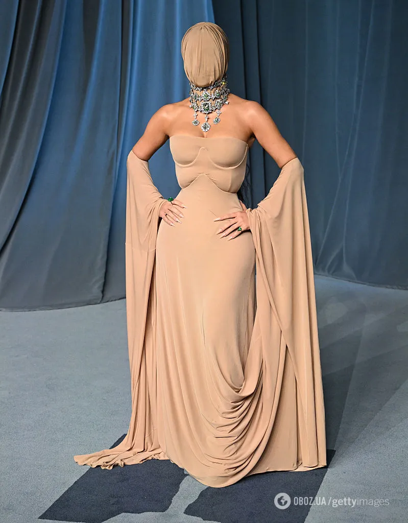 Кардаш'ян прибула на червону доріжку у тілесній масці, яка повністю закривала голову та волосся. Образ доповнила нюдова сукня, як пише Daily Mail, від Maison Margiela з корсетом і рукавами, прикріпленими до подолу спідниці, які при русі створювали ефект "крил кажана". Зірка також обрала діамантовий чокер, смарагдові каблучки та гострий манікюр.