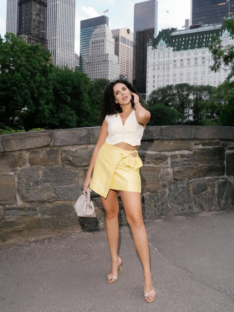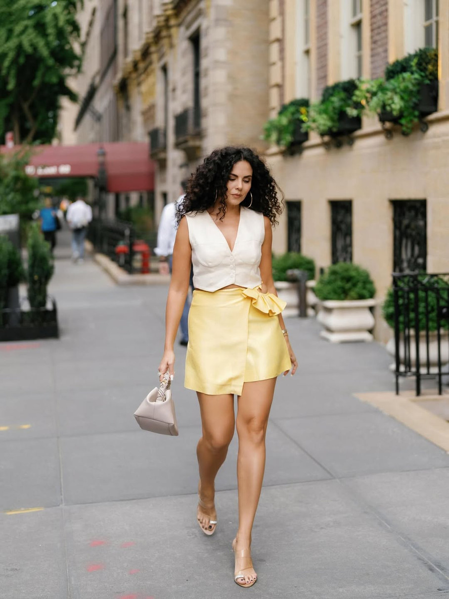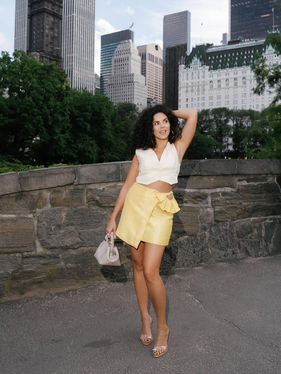 На фото, які зірка опублікувала в Instagram, вона позує на тлі хмарочосів у жовтій атласній спідниці асиметричного крою з вирізом та рюшами на боці та білій укороченій блузі.