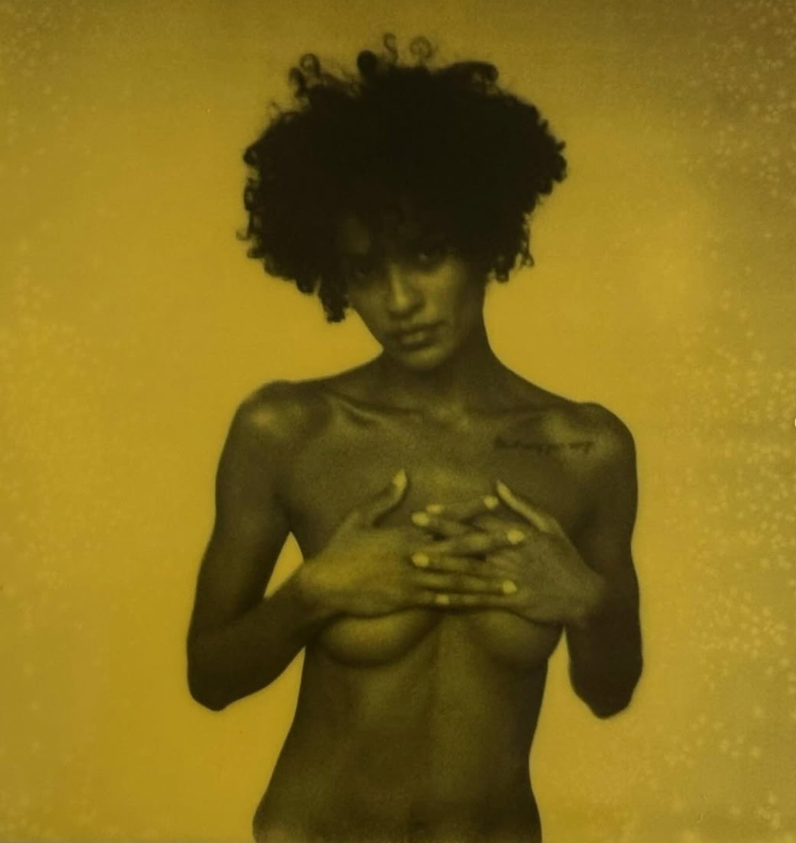 На першому фото в стилі полароїду, зробленому в Парижі, 29-річна дівчина постала топлес, грайливо прикриваючи груди руками.