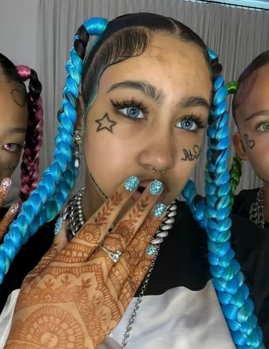 Крім того, Норт заплела своє блакитне волосся у коси та похвалилася блакитними блискучими нігтями і розмальованими хною руками.