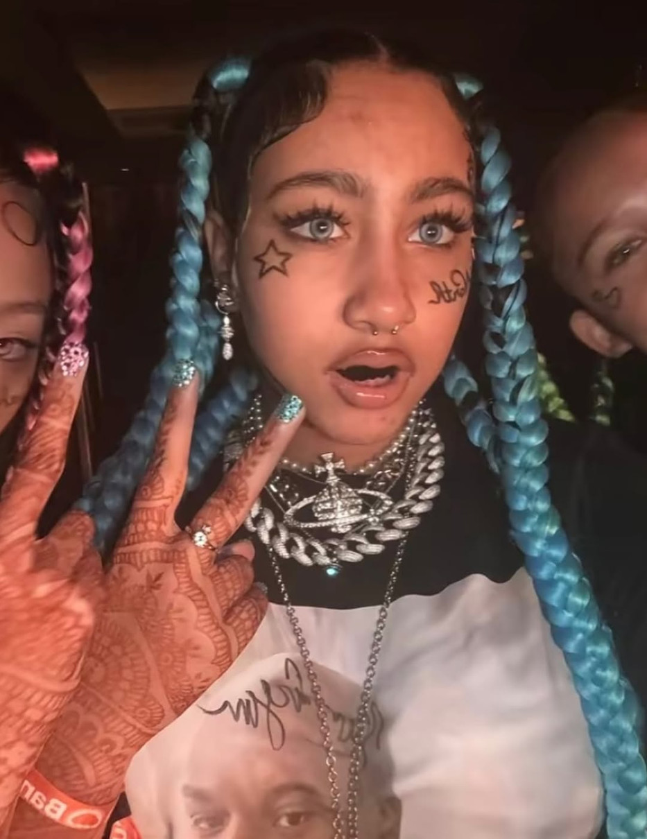 Старша дитина Кім і Каньє виклала в соцмережі фото і відео, на яких вона з блакитними лінзами в очах, з чорними гріллзами на зубах, з довгими нарощеними віями, тату на щоках і сережкою в носі. Щоправда тату і пірсинг - лише імітація.