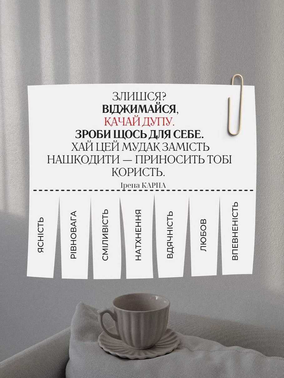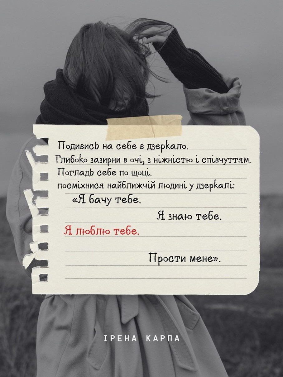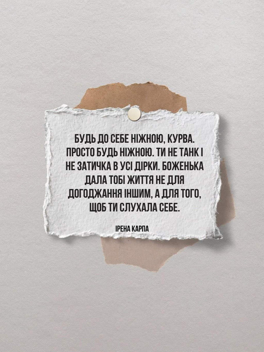 Іще Карпа радить дівчатам не забувати, що "мудаків на світі багато, а ти в себе одна", і бути ніжними до самих себе. А злість вона закликає перетворювати на джерело енергії.