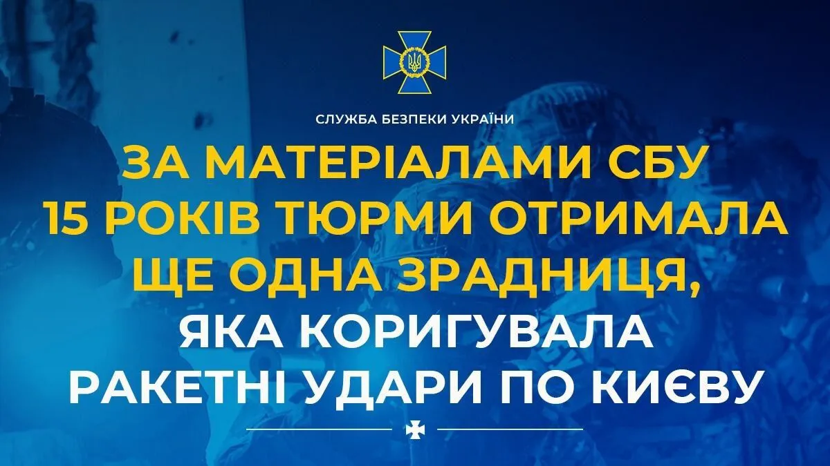 "За доказовою базою Служби безпеки 15 років ув’язнення з конфіскацією майна отримала ще одна агентка ФСБ, яку викрили в липні 2022 року на коригуванні повітряних атак рашистів по Києву", – розповіли в пресслужбі.