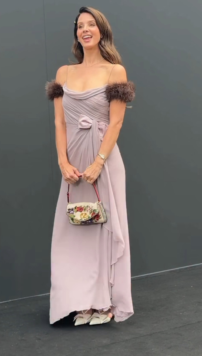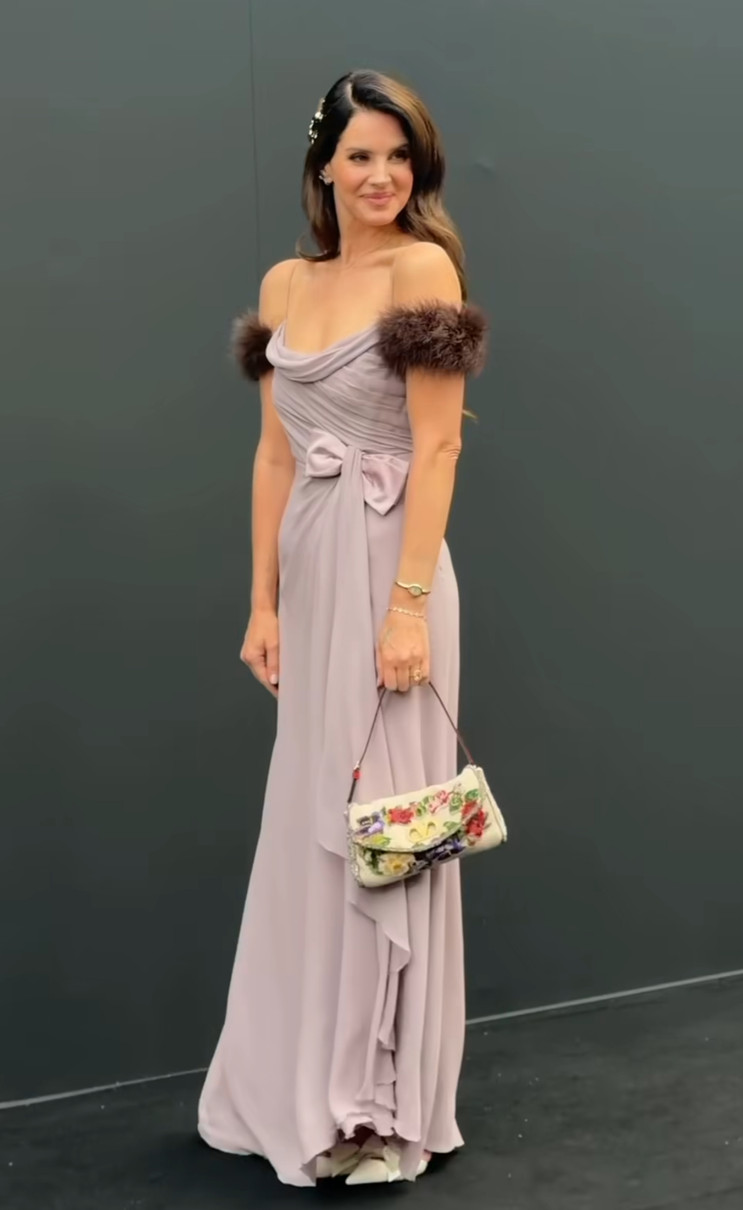 Для заходу на Тижні моди 40-річна виконавиця вдягнула шифонову лавандову сукню з хутряними деталями на плечах. На ногах у неї були білі підбори з бантиками, а волосся зірка заколола різноманітними шпильками.