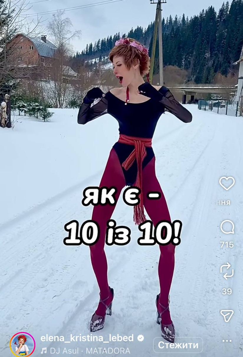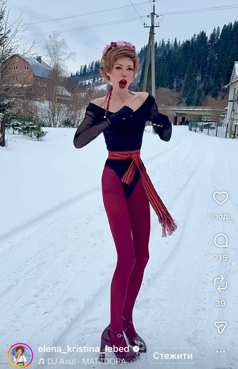 У своєму Instagram Лебідь показалася посеред засніжених гір тільки у чорному боді з рукавами-сіточками, бордових колготках та на високих підборах. На голову вона одягнула чільце (традиційний український головний убір - оздоблений обруч).