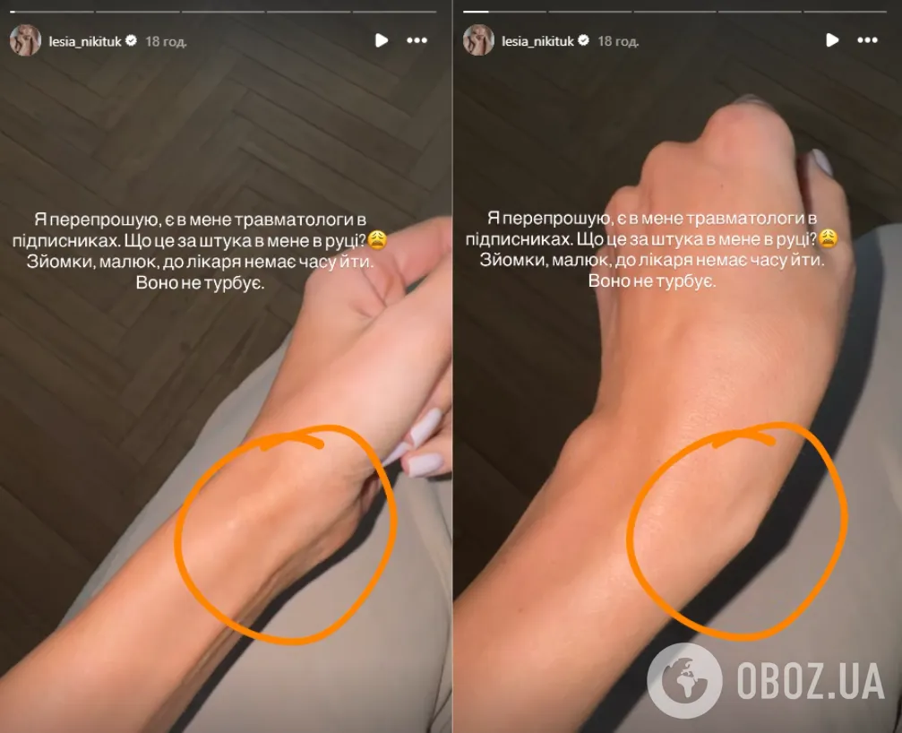 У короткому відео, яке Нікітюк опублікувала в Stories, видно, як під шкірою під час рухів рукою зміщується об’ємна шишка.