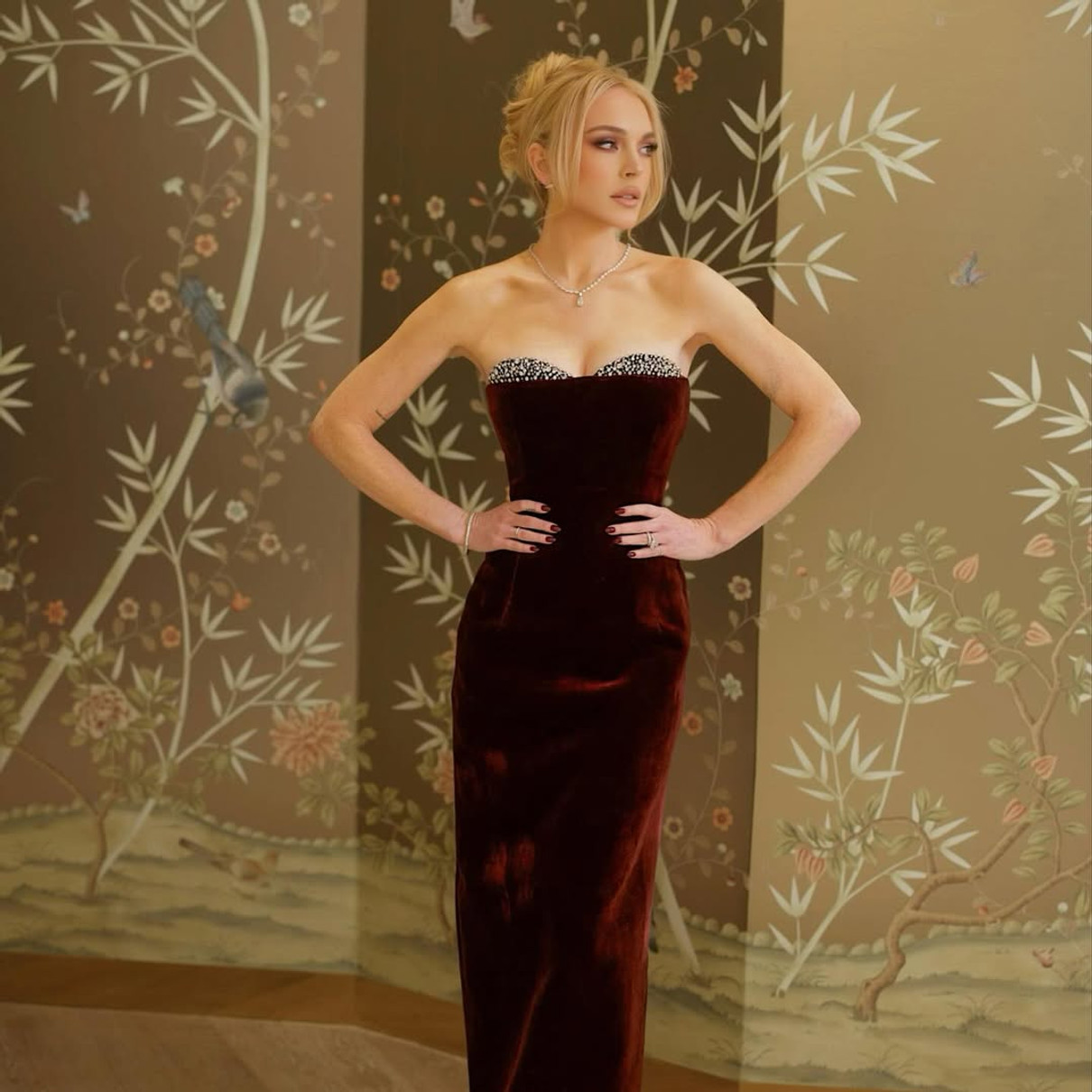 Ліндсей вийшла на червону доріжку у розкішній оксамитовій максі-сукні без бретелей темно-бордовому кольорі та з сяючими вставками у районі декольте від бренду New Arrivals.