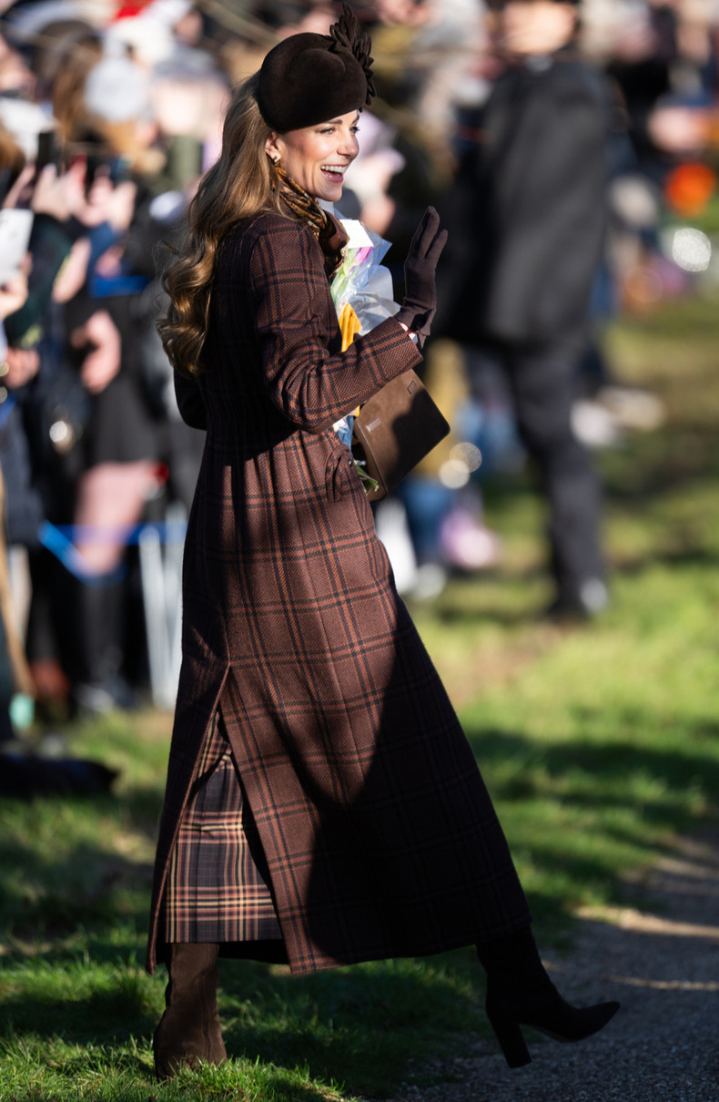 А ось Її Високість Кейт зупинилася на шоколадному аутфіті, що складався з коричневого пальто в клітинку від Blazé Milano, шарфа з принтом та фетрового капелюшка в тон.