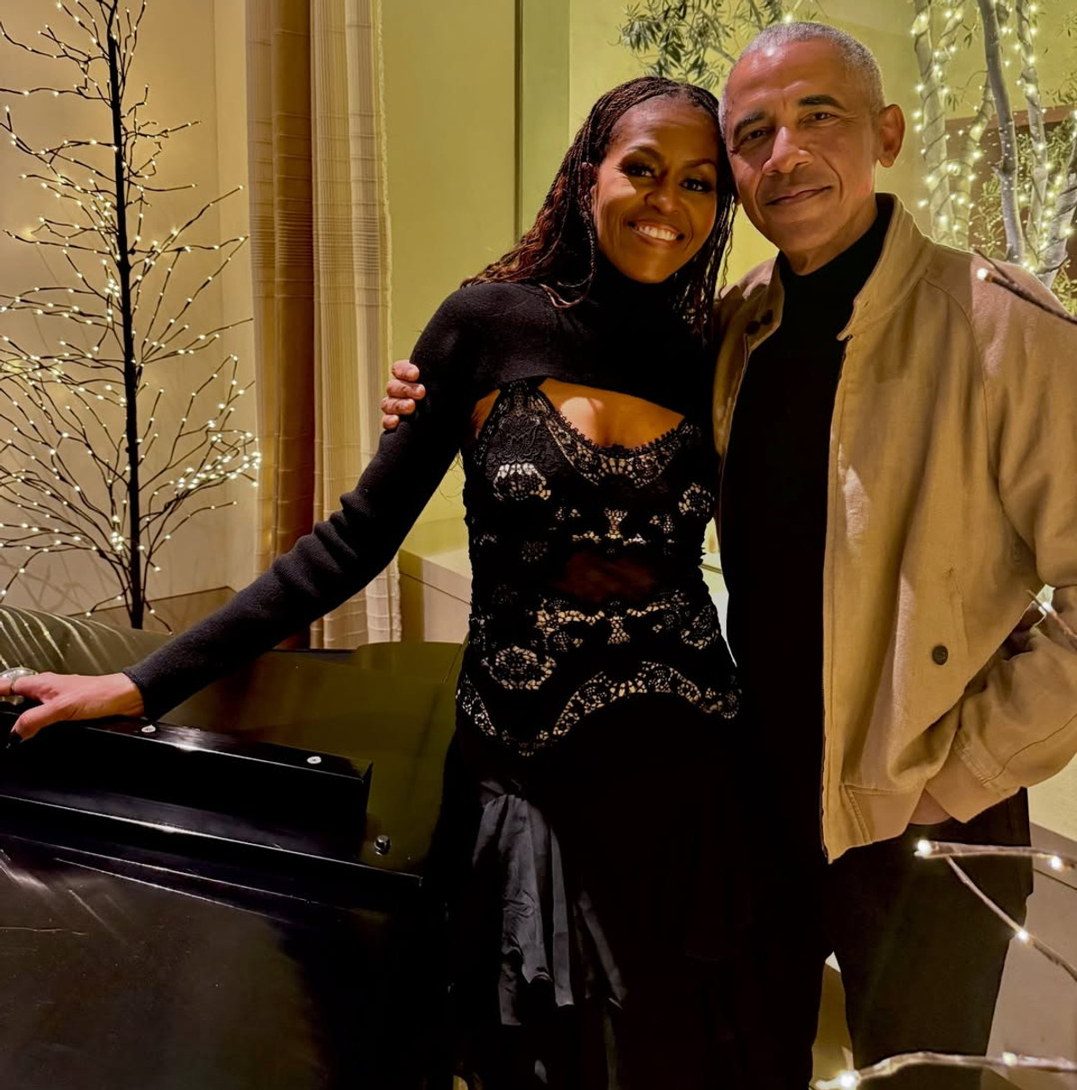 У своєму Instagram Мішель показала фото зі святкування, на якому в чорній декольтованій сукні з мережива та з довгими рукавами притулилася до свого чоловіка у кежуальному луці.