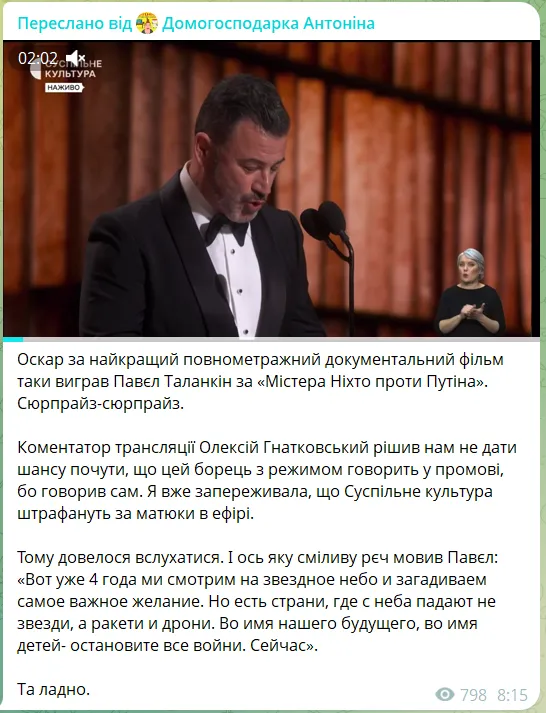 "Оскар за найкращий повнометражний документальний фільм таки виграв Павєл Таланкін за "Містера Ніхто проти Путіна". Коментатор трансляції Олексій Гнатковський рішив нам не дати шансу почути, що цей борець з режимом говорить у промові, бо говорив сам. Я вже запереживала, що "Суспільне Культура" штрафануть за матюки в ефірі", – написала вона.