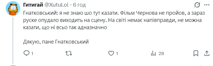 "А зараз це опудало виходить на сцену і буде пропагувати наративи, які нам ворожі. Я скажу вам таке: на світі немає напівправди. Не можна казати, що не все так однозначно, бо все дуже однозначно. Хороших ворогів не буває. Не знаю, чи треба нам чути зараз цю мову в ефірі", – заявив Гнатковський.