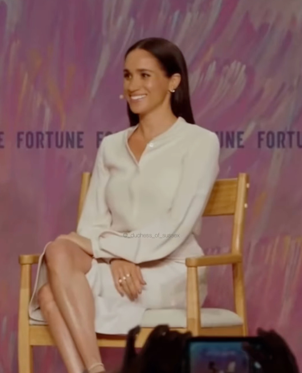 На зустрічі на тему розвитку бізнесу у Вашингтоні Меган доповнила свій світлий аутфіт каблучкою з жовтого золота, прикрашену діамантами. Усі прикраси, скоріше за все, привіз з України її чоловік, принц Гаррі після свого візиту до Києва.