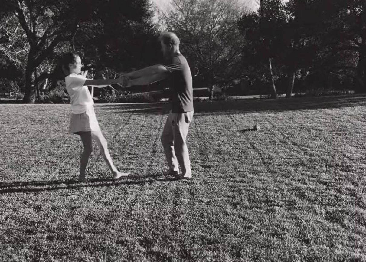 У своєму Instagram Меган показала чорно-білі кадри, на який у домашньому одязі танцює посеред подвір'я зі своїм чоловіком.