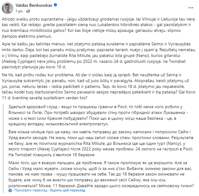 Йдеться про концерт гурту, який має відбутися 18 березня у Вільнюсі. Бенкунскас закликав державні інституції посилити законодавство, щоб не допустити виступів артистів, пов’язаних із російським культурним ринком.